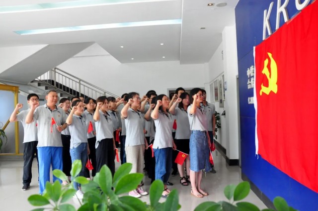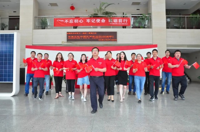 聽到熟悉的樂曲響起,阿特斯光伏電力(洛陽)有限公司的黨員們從各個(gè)辦公室走出,隨著節(jié)拍舞動(dòng)手中的小國(guó)旗,帶著滿腔的熱忱、昂揚(yáng)的斗志,高聲唱起“他指給了人民解放的道路,他引導(dǎo)中國(guó)走向光明......”