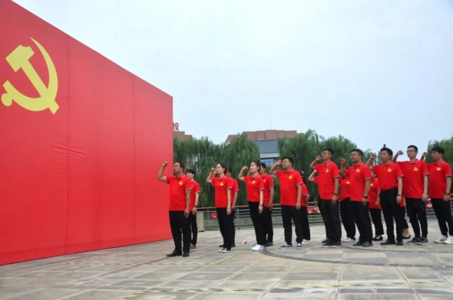 蔚藍(lán)的天空下,闊大的中心湖平臺上,一面鮮艷的黨旗高高聳立。兩名旗手高舉黨旗和國旗,沿著炎黃科技園黨建長廊向平臺飛奔而來。